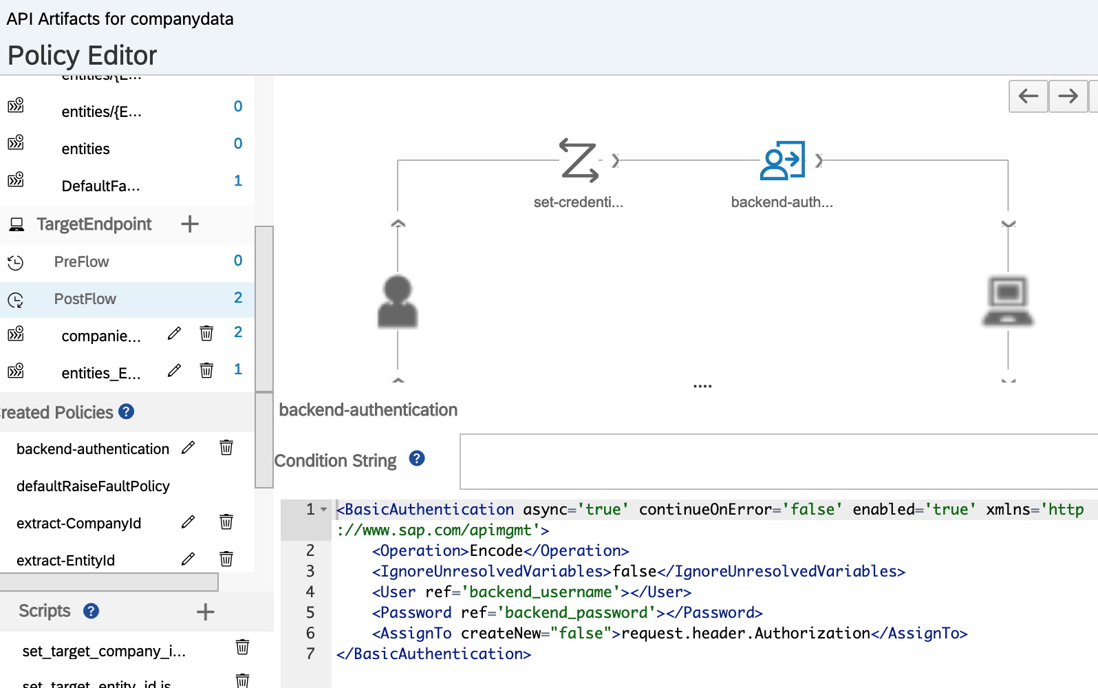 Für die Backend-Credentials fügen wir zunächst eine "Assign Message" Policy zum Incoming-Request-Stream des Target-Endpoint-Postflows hinzu, und fügen die entsprechenden Daten für den COMPANYDATAUSER_READONLY