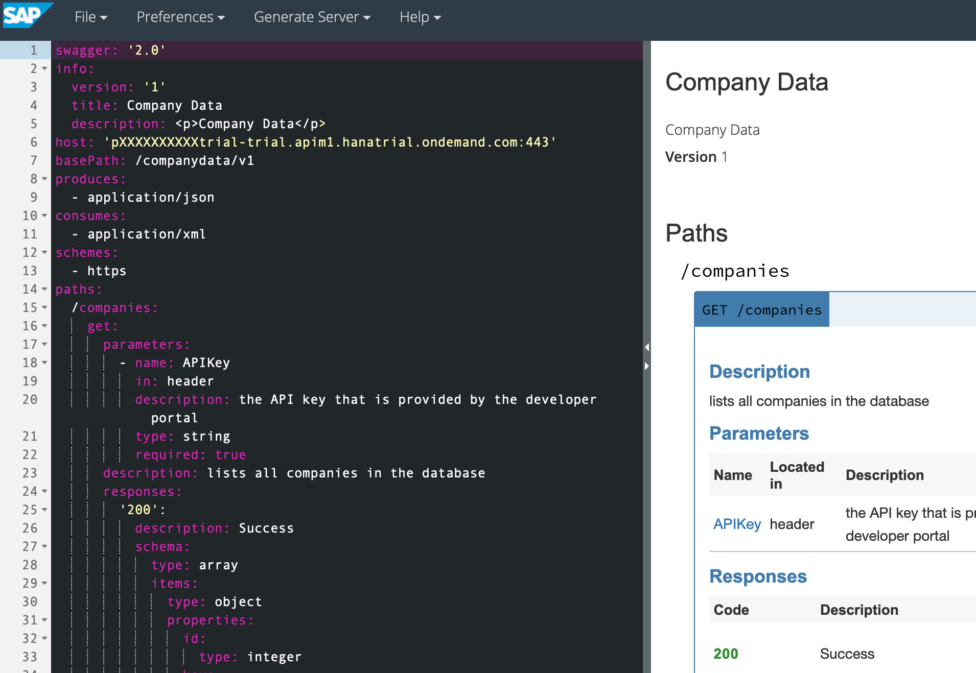 $ curl -sH "APIKey: *********" https://pXXXXXXXXXXtrialtrial.apim1.hanatrial.ondemand.com/p2000572343trial/companydata/v1/companies/0 |xmllint --format -