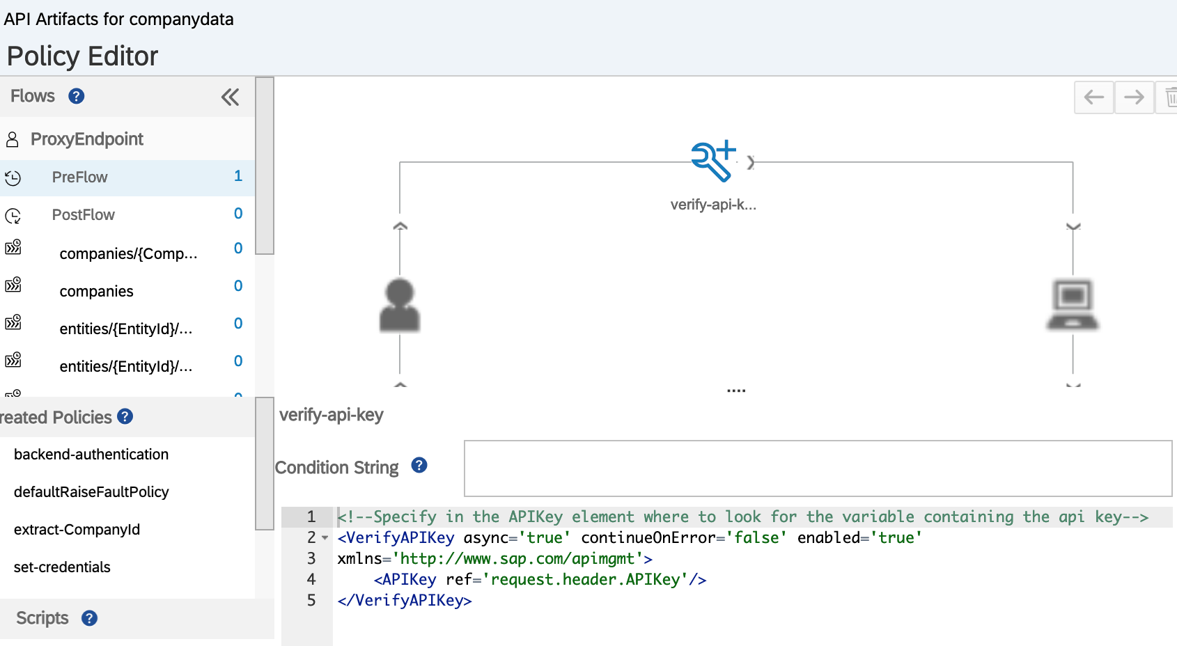 Für die APIKey-Validierung können wir die vorgefertigte Policy "Verify API Key" zum Incoming-Request-Stream des Proxy-Endpoint-Preflows einfügen: