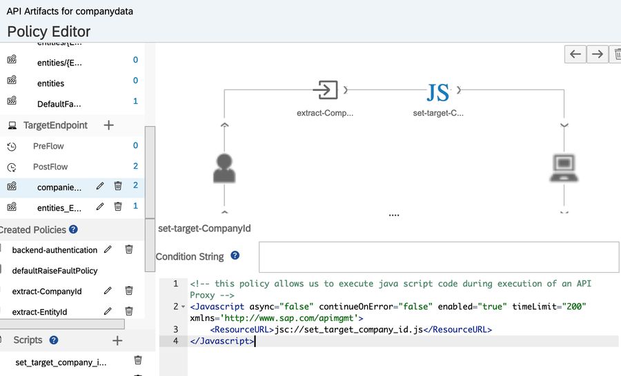 In diese Conditional-Flows fügen wir nun Policies zum extrahieren der Variablen ein und gegebenenfalls zum umschreiben der URL für einen gültigen OData-Call. Für das Beispiel /companies/{CompanyId}